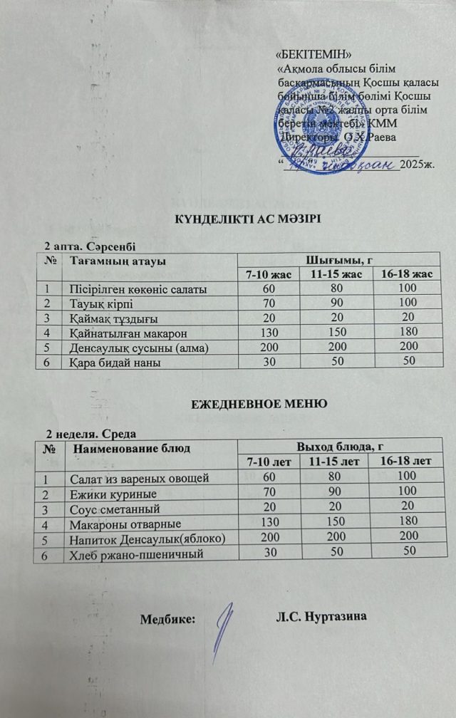 10 желтоқсан (сәрсенбі) ас мәзірі
