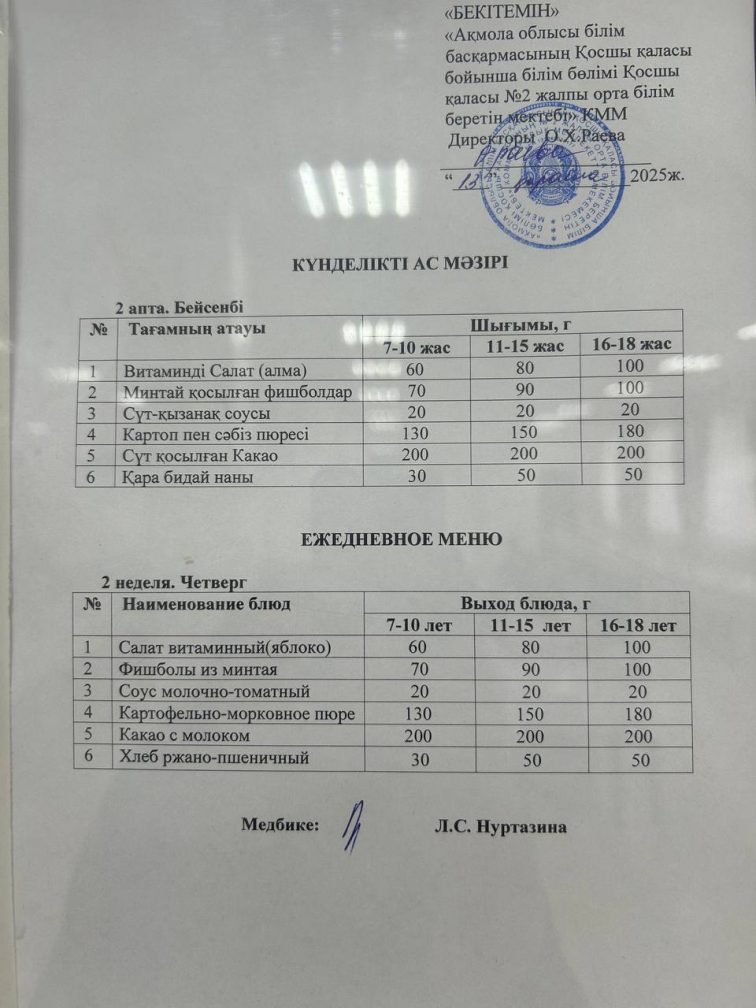 13 қараша (бейсенбі) ас мәзірі