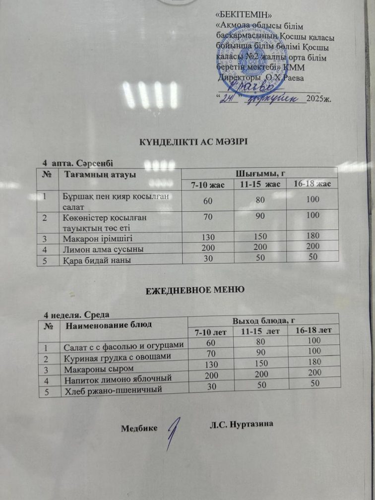 24 қыркүйек (сәрсенбі) ас мәзірі