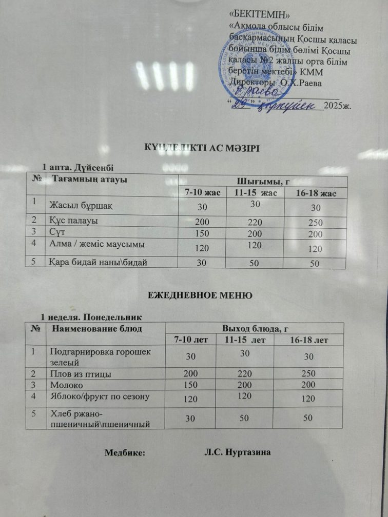 29 қыркүйек (дүйсенбі) ас мәзірі
